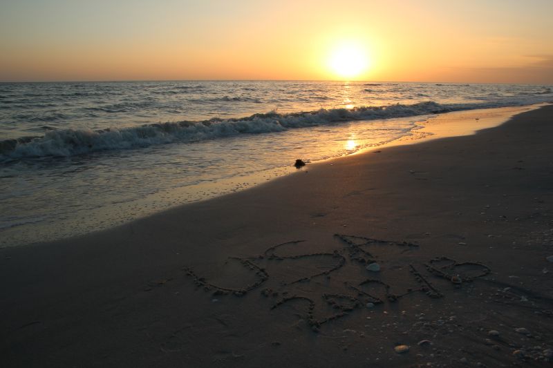 Der Strand kam uns schöner vor als Bowman’s Beach, aber das lag sicher daran, dass die meisten Leute schon nach Hause gefahren waren und es jetzt schön leer war. Wir sammelten Muscheln, machten Fotos und warteten auf den Sonnenuntergang – unser erster „richtiger“ Sonnenuntergang über dem Meer, weil wir ja jetzt an einer Westküste sind – der ein wunderschönes Naturschauspiel war.