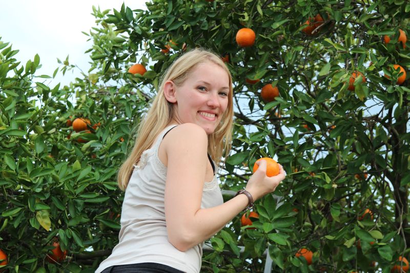 Nach ca. anderthalb Stunden erreichten wir dann die ersten Außenbezirke von Orlando, wo wir eine Zitrusfrüchteplantage besuchen wollten, „Showcase of Citrus“. Dort schnappten wir uns einen Beutel, den man für 10 Dollar mit allem befüllen konnte, was man wollte – sehr aufregend, da wir beide noch nie Zitrusfrüchte gepflückt hatten. Nachdem wir den unvermeidbaren amerikanischen Ramsch-Laden (mit alten Zapfsäulen, einem riesigen Plastikhai und einem austgestopften (?) Krokodil) passiert hatten, liefen wir über die Plantage und kosteten als erstes unglaublich süße Kumquats, kein Vergleich zu den Kumquats in deutschen Supermärkten. Wir pflückten und probierten auch Orangen in verschiedenen Sorten, Tangerines (so was wie Mandarinen), Key Limes und Grapefruits.