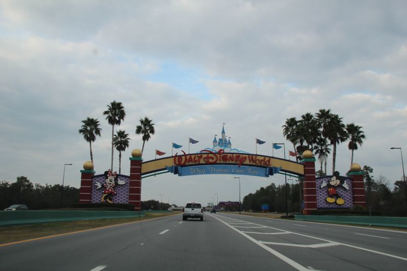 Anschließend fuhren wir nach Orlando. Je näher wir an die ganzen Themenparks, v.a. Disney World, kamen, desto stärker schritt die Kommerzialisierung voran. Auf einer breiten Straße wuchs die Dichte an Motels und Kettenrestaurants und kleineren Vergnügungsparks die von der Berühmtheit der großen leben ins Unermessliche. Wir fuhren einfach aus Spaß einmal auf die Straße von Disneyworld und passierten Bald einen riesigen Torbogen, der uns in Disneyworld willkommen hieß. Übrigens ist Disneyworld so groß wie San Francisco oder 2x so groß wie Manhattan, der größte und meistbesuchte Themenpark der Welt und der größte Arbeitgeber bei dem alle Arbeiter an einem Ort arbeiten in den USA. Da wir uns nun auf Walt Disneys Privatgelände befanden (auch wenn die Straße ganz normal als Autobahn weiterging), waren alle Straßenschilder plötzlich mit „Magic“ versehen und im Disney-Design mit Mickeymaus und in lila, wie als hätten wir plötzlich den Planeten gewechselt, bizarr!