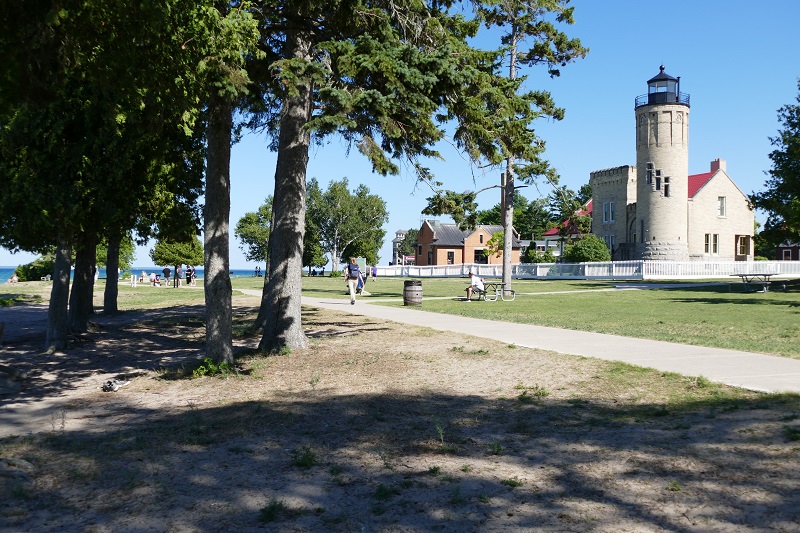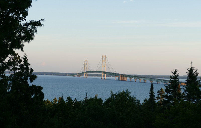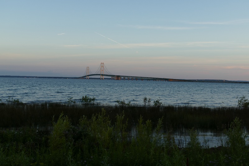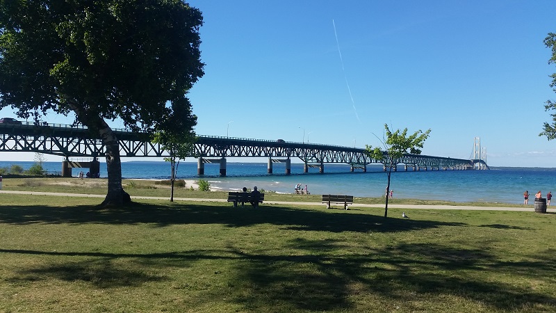 Da Sandburgen bauen anstrengend ist, musste vor der Weiterfahrt erst einmal eine Stärkung her. Die Picknick Bänke am Parkplatz luden hervorragend dazu ein. Dann verließen wir den State Park und erreichten wenige Meilen später Mackinaw City. Hier hatte man einen tollen Blick auf die Big Mac, mit über 8 Kilometern eine der längsten Hängebrücken der Welt. Diese verbindet Michigans Lower Peninsula mit der Upper Peninsula. Außerdem konnte man auch die Fähren beobachten, die nach Mackinac Island fuhren bzw. von dort zurückkamen.