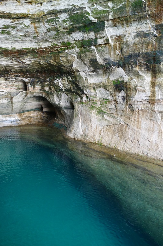 Und nach einer kurzen Pause mussten wir auch schon wieder los, schließlich hatte ich nicht nur das Cottage, sondern auch die Tickets für die Pictured Rocks Bootstour von Deutschland aus gebucht. Mit den eTickets in der Hand konnten wir direkt zum Pier gehen und uns in die dortige Warteschlange einreihen. Aufgrund eines Tipps aus diesem Forum drängten wir nicht mit der Masse aufs Oberdeck sondern gingen unten in das Boot und setzten uns an eines der offenen Fenster.