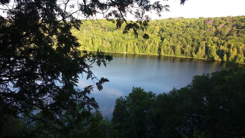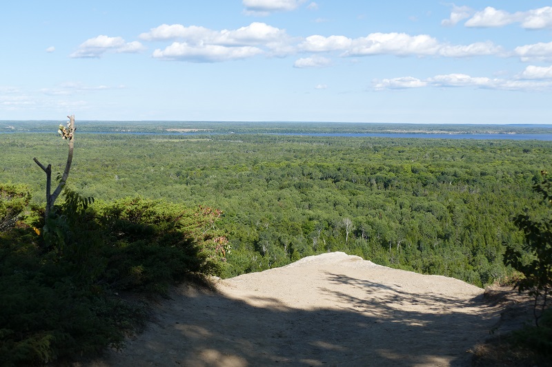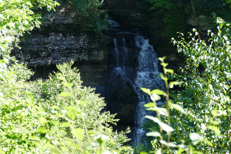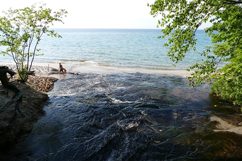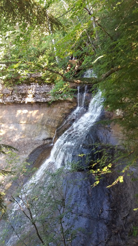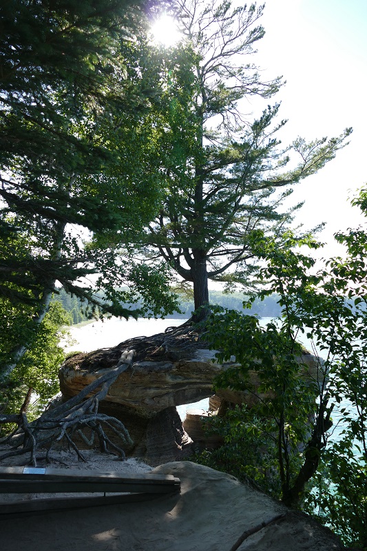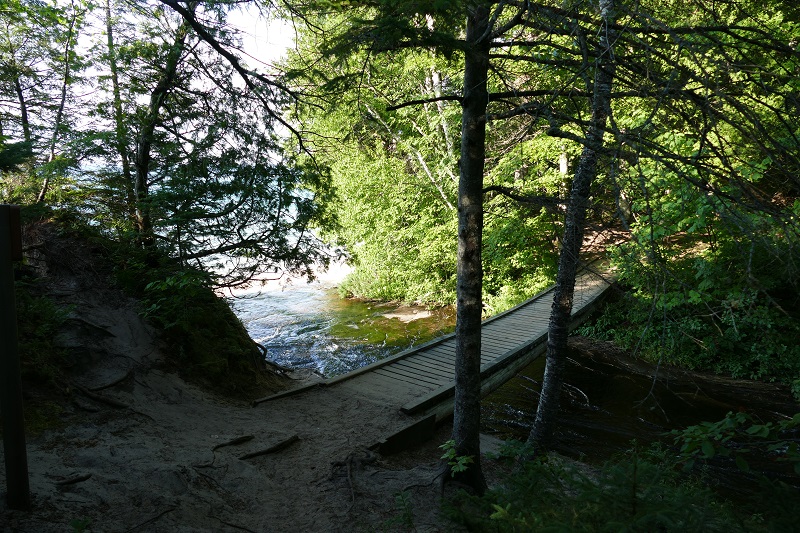 Insgesamt verbrachten wir hier am Strand mehrere Stunden, viel länger, als wir vermutet hatten. Erst nachmittags gegen 15.30 Uhr brachen wir zum nächsten Ziel auf. Wir fuhren den Parkplatz zum Chapel Rock an. Von dort führt ein 3.2 mi (etwas über 5 km) langer Wanderweg durch den Wald. Und damit standen wir vor einem Problem, denn eigentlich wollten wir heute mehrere Stellen der Pictured Rocks National Lakeshore anfahren und über Grand Marais und Deer Park nach Newberry fahren, wo unser nächstes Hotel vorgebucht war. Jetzt hatten wir bereits außerplanmäßig den Miner's Beach eingeschoben und dort mehrere Stunden verbracht. Was tun? Da wir nicht wussten, wie lange die Wanderwege an den anderen Stellen sind, entschieden wir uns, die Wanderung zum Chapel Rock zu machen. Im Nachhinein betrachtet war es die goldrichtige Entscheidung. Für den Hinweg, der uns an den Chapel Falls vorbei führte, benötigten wir knapp anderthalb Stunden.