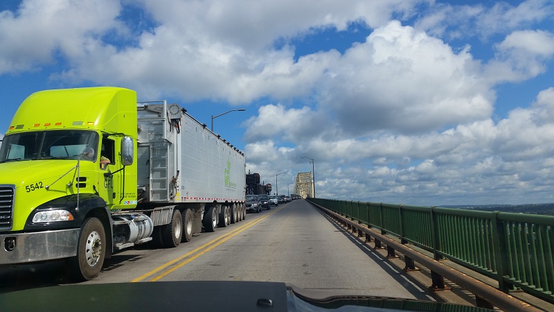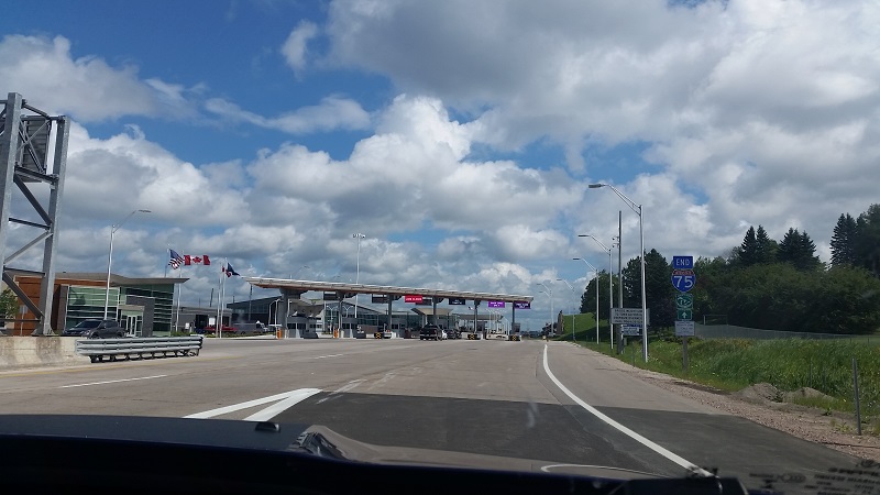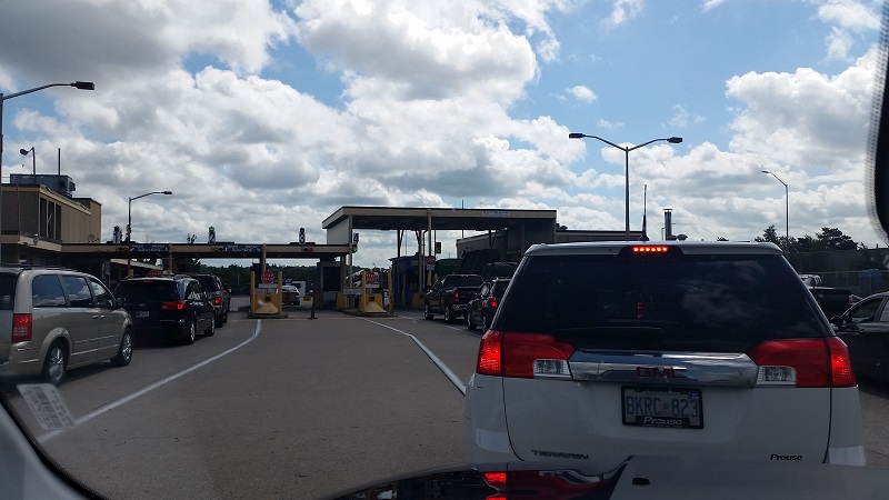 Schließlich machten wir uns auf den Weg zur Brücke. Bei der Auffahrt ist eine Mautgebühr in Höhe von $3.50 zu entrichten und man fährt an den Häuschen für die US-Einreise vorbei. Auf der anderen Seite angekommen steht man dann logischerweise an der kanadischen Grenzkontrolle an. Der Immigration Officer war zwar deutlich freundlicher als der, den wir bei der US-Einreise am Detroiter Flughafen hatten, er wollte aber alles sehr genau wissen, sogar in die wievielte Klasse Dominic geht und was wir Eltern arbeiten. Mit dem von ihm ausgefüllten gelben Zettel mussten wir ins Gebäude nebenan, wo wir die kanadischen Stempel in unsere Reisepässe bekamen.