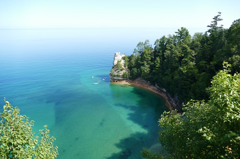 Wir haben lange geschlafen und sind erst gegen 9.30 Uhr aufgestanden. Da es im Alger Falls Motel eh kein Frühstück gab und eigentlich nur ein paar Trails zum Wandern in der Pictured Rocks National Lakeshore auf dem Programm standen, war uns das zu diesem Zeitpunkt noch egal. So fuhren wir nach dem Check-out erst mal gemütlich zur Tanke und dann weiter zum Miner's Castle Overlook. Hier hat man einen wunderschönen Blick auf den Lake Superior und die Felsformation am türkisfarbenen Wasser. Wie in einer Lagune, herrlich!