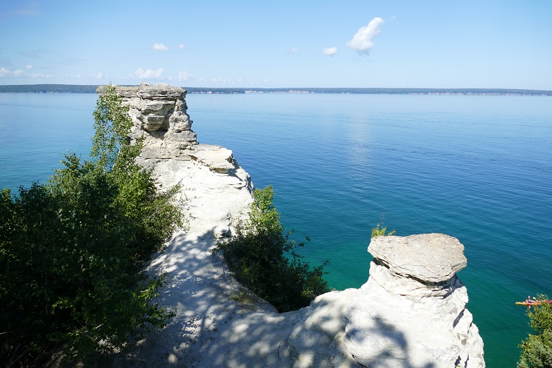 Seit wir letztens auf dem Manistique River Kanu gefahren sind, wollte Dominic mal alleine in einem Kajak fahren. Frisch gestärkt beschlossen wir, in unserer Bucht Kajak und Kanu zu fahren. Ausleihen konnte man diese bei unserer Vermieterin. Und so fuhren wir eine gute Stunde lang in der Bucht (Dominic im Kayak, Chris und ich in einem Kanu) und betrachteten das Black Rock Resort und die Felsküste vom Wasser aus.