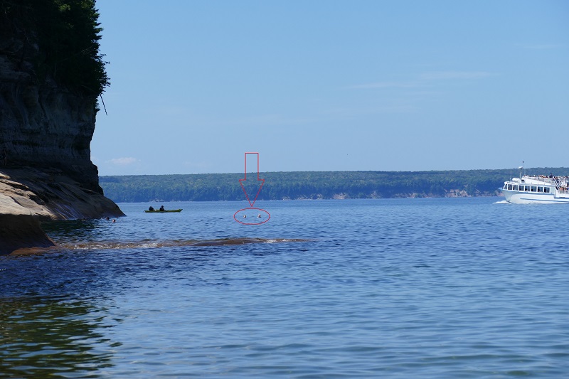 Irgendwann entschieden Dominic und ich, die halbe Meile (einfacher Weg) zum Miner's Castle zu schwimmen. Chris blieb am Strand zurück und passte offiziell auf die Sachen auf (tatsächlich hat sie sich nicht getraut, aber das verraten wir hier nicht). Pro Strecke schwammen wir ca. 15 Minuten und es hat sich mehr als gelohnt. Letztendlich saßen wir tatsächlich in der Höhle, die oben auf dem Bild vom Miner's Castle Overlook zu sehen ist. Auf der Seeseite gab es noch weitere Höhlen, die wir auf dem Rückweg besuchten (diese sind auf dem gestrigen Bild von der Pictured Rocks Cruise zu sehen).