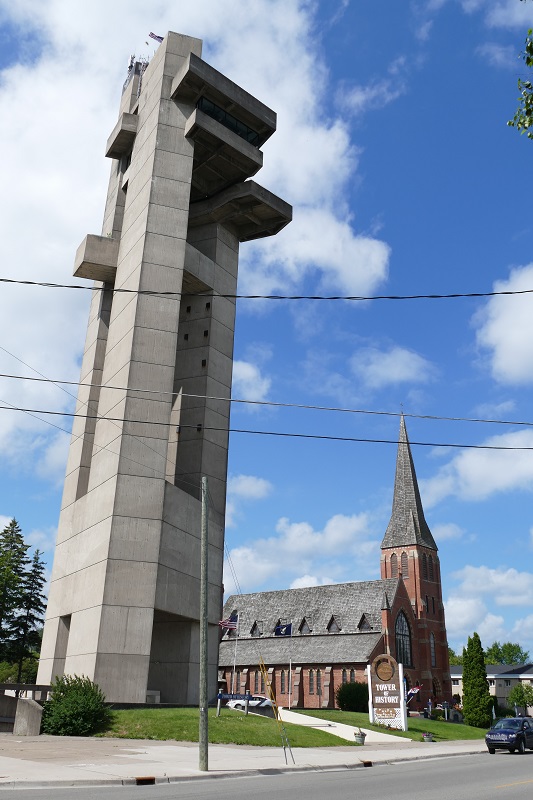 Unser eigentliches Ziel aber war der Tower of History. Von der Aussichtsplattform des Turms hat man einen super Ausblick auf die amerikanische und die kanadische Seite der geteilten Stadt. Wir konnten die Brücke sehen, die die beiden Stadthälften miteinander verbindet und die wir kurze Zeit später befahren sollten, ebenso wie die Schleusenanlagen, die den Lake Superior und den Lake Huron verbinden. Im Tower gibt es noch eine kleine Ausstellung zu den Indianern aus der Region.