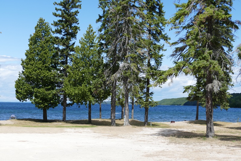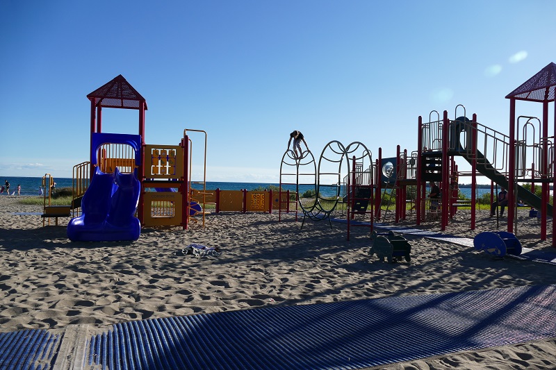 Um 17:00 Uhr brachen wir auf und fuhren wiederum über M’Chigeeng nach Süden am Lake Mindemoya entlang nach Providence Bay. Hier gab es direkt am feinen Sandstrand einen großen Spielplatz. Zum Baden war es uns mittlerweile zu kühl und zu windig, aber Schaukeln ging für Klein und Groß.