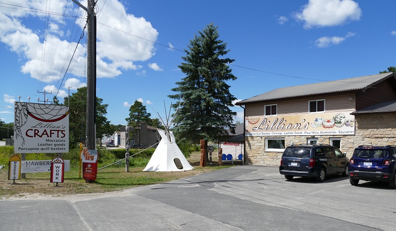 Entlang des Lake Manitou, dem größten Binnensee innerhalb der Insel, fuhren wir Richtung Nordwesten über Green Bay nach M’Chigeeng. Dieser Ort hat ein kulturelles Zentrum für die indianischen Ureinwohner und insgesamt hatten wir den Eindruck, dass hier die indianische Kultur noch am Intensivsten gelebt wird. In der kleinen Tankstelle beispielsweise hing ein Foto des Little Native Hockey Teams, links und rechts davon standen Pokale. Nebenan lockte uns die Eingangstür von Lillian’s indianischem Kunstgewerbelädchen. Dieses war um Welten besser als der Ten Mile Point. Wir stöberten eine ganze Weile herum und fanden richtig tolle Sachen.