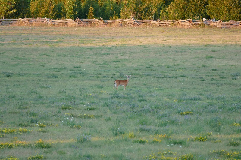Nach guten drei Stunden waren wir wieder unten am Parkplatz. Vom Klettern und Laufen hungrig geworden, steuerten wir ein Restaurant in M’Chigeeng an. Hier haben wir sehr gut und reichlich gegessen, allerdings leider nicht wie erhofft indianisch. Dafür sind wir mit einem einheimischen Ehepaar ins Gespräch gekommen und haben viel über Manitoulin Island und die hiesige Lebensart erfahren. Zudem erfuhren wir, dass man auf der Insel seit Wochen sehnlichst auf Regen wartete und dieser Sommer im Durchschnitt 5° wärmer war als sonst. Das erklärte natürlich, warum hier alles gelb und braun war, anstatt in saftigem Grün. Und wir wurden gefragt, ob wir schon eines der zahlreichen Deers auf der Insel gesehen hätten. Nein, hatten wir noch nicht. Kein einziges. Das sollte sich auf der Fahrt zurück zu unserer Unterkunft ändern. Ein einzelnes stand hier mitten im Feld und graste.