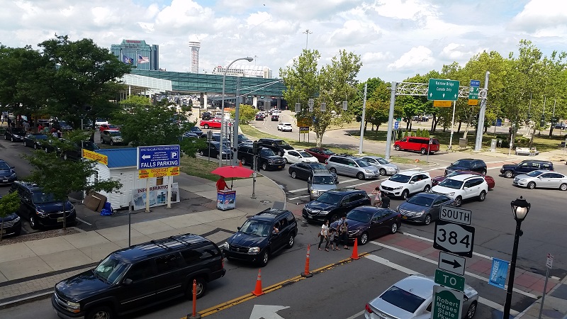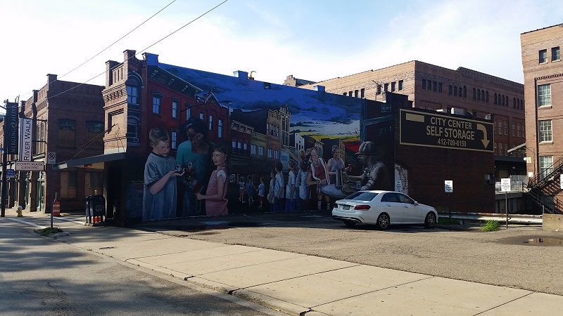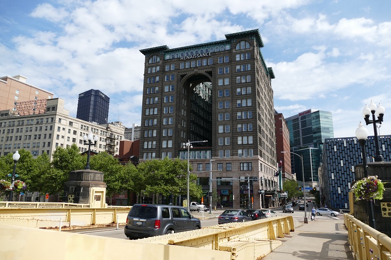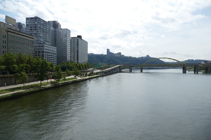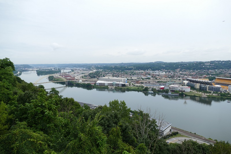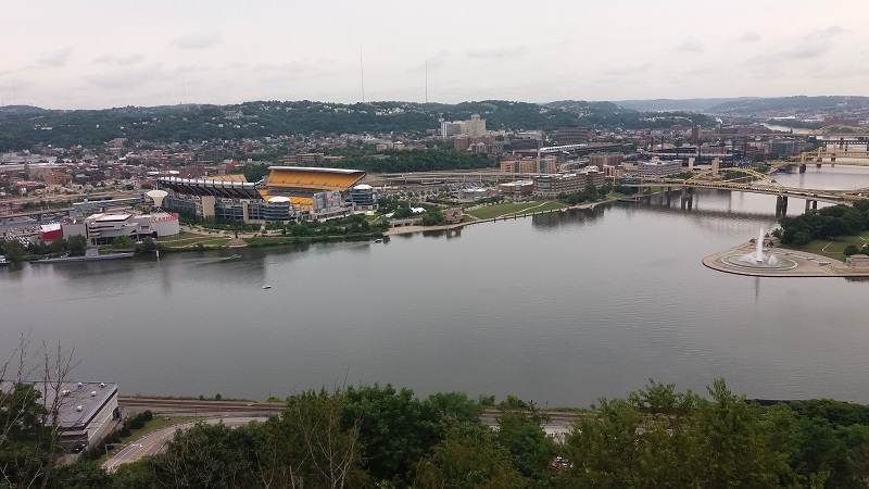 Tag 19: Montag, 15.08.2016 (Über 446 Brücken musst Du geh'n)Wir haben wieder lange geschlafen. Erst um 09:30 Uhr waren wir beim Frühstück im Hotel. Wir überlegten uns, den Shuttleservice des Hotels für die Fahrt nach Downtown Pittsburgh in Anspruch zu nehmen, entschieden uns dann aber aufgrund der höheren Flexibilität für unseren Mietwagen. Nachdem wir ausgecheckt hatten, fuhren wir auf den Mt. Washington, einem der Berge um Pittsburgh. Man könnte Pittsburgh auch Klein San Francisco nennen. Die Straßen gehen steil bergauf und bergab und die Fahrerei erinnert teilweise arg an die Westküstenstadt.