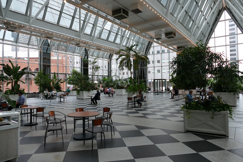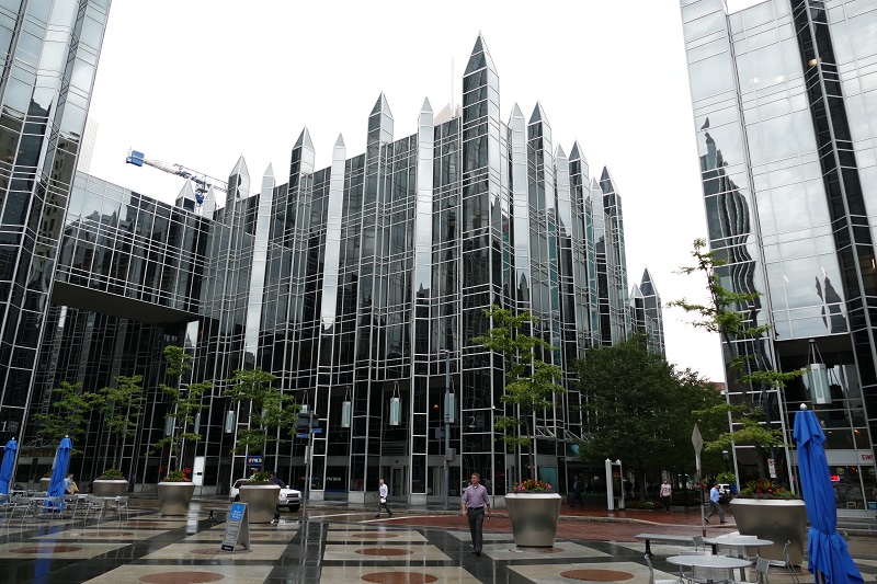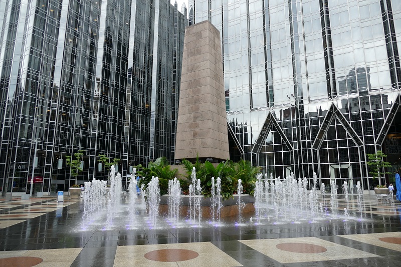 Als es wieder trocken war, setzten wir unseren Erkundungstrip fort und landeten am PPG Place, der vollständig von futuristisch anmutenden Hochhäusern mit Glasfassaden umgeben war.