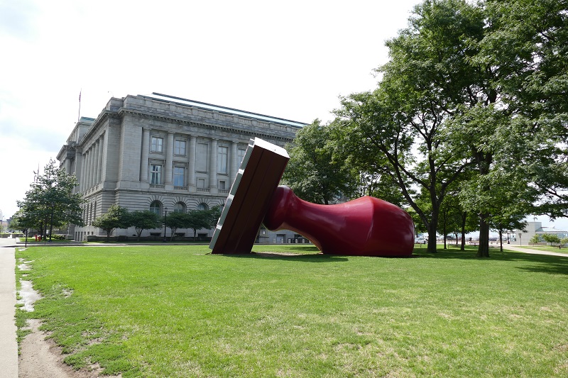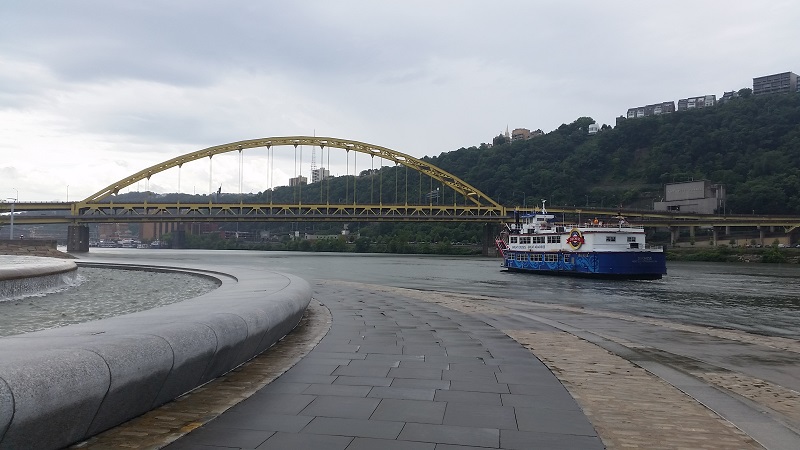 Unseren Fußmarsch fortsetzend, holte uns der nächste Regenschauer ein und bat uns freundlich, irgendwo unter zu stehen. Dieser Boxenstopp dauerte eine gefühlte Ewigkeit, bis wir irgendwann beschlossen, unter die Brücke am Fort Pitt Museum zu huschen. Auch hier harrten wir eine ganze Weile aus und beobachteten neben dem Regen, der mal weniger und mal stärker wurde, auch einen Radfahrer, der eine Panne hatte und seinen Reifen wechselte.