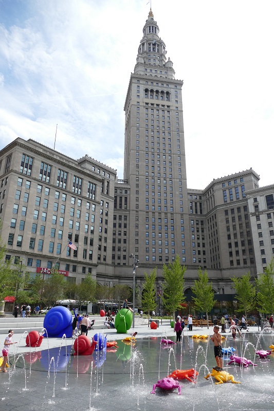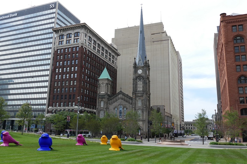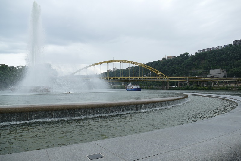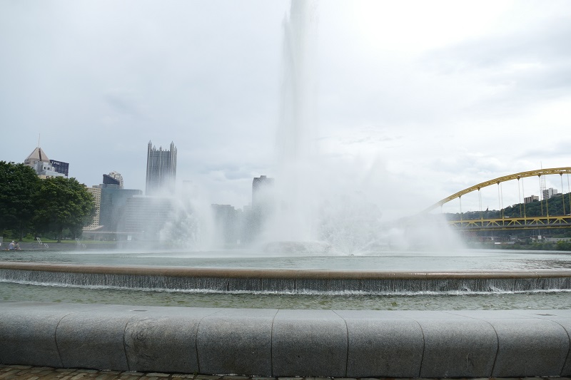 Bei strahlendem Sonnenschein verließen wir gegen 17:30 Uhr Pittsburgh und machten bei dieser Gelegenheit nochmal ein Bild vom Springbrunnen und der Downtown mit blauem Himmel.