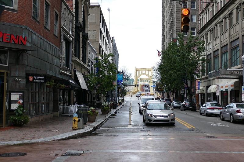 Wieder oben angekommen, fuhren wir mit dem Auto ins Stadtzentrum und suchten uns ein Parkhaus. Pittsburgh hat so unglaublich viele verwinkelte Straßen, dass es selbst mit einem Navi schwer ist, sich nicht zu verfahren. Soll man nun links abbiegen? Oder halblinks? Oder ganz links? Und egal welche Straße man nimmt, man landet mit ziemlich hoher Wahrscheinlichkeit auf einer Brücke.
