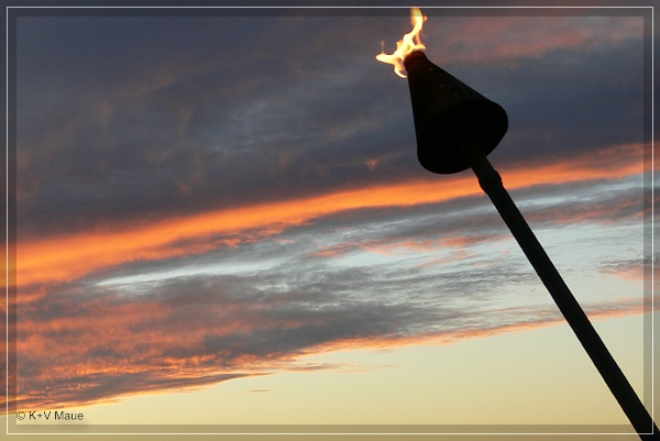 Es gab Fresh Spearfish und Beer-Battered Mahi sowie einen Pina Colada und einen Mai Tai ($46 plus Tip). Die Fackeln wurden gerade angezündet und die Sonne ging unter - einfach nur schön!