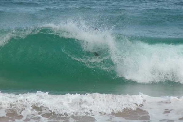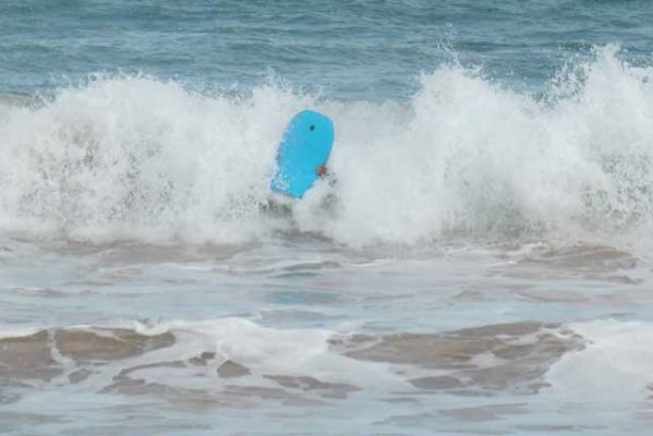 wir landen erst an der südlichen Seite des Strandes und werden von der Strandaufsicht aus dem Bereich für Surfer verscheucht, aber daneben ist genug Platz für Boogie Boarder und Wellen gibt es genug, wirklich genug schöne, hohe, sich überschlagende, perfekt für uns.