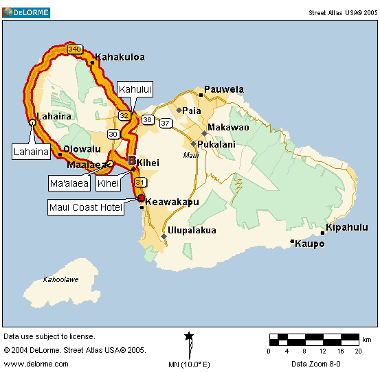 Um 6:15 pm verließen wir das Restaurant, schließlich lag noch die lange Fahrt über die Hana Road nach Kihei vor uns. Anfangs kamen uns noch etliche Autos entgegen, doch das ließ bald nach und ich kam sehr gut voran. Kurz vor Paia hatten wir offenbar einen "Stopper", also einen Langsamfahrer vor uns und entsprechend langsam kamen wir voran. Trotzdem brauchten wir, von Hana bis nach Kihei, nur 1,75 Stunden!!! Ich gehe davon aus, dass das Weltrekord ist