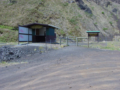 Nicht lange, nachdem wir dem Weg auf die Westseite folgten, begegneten uns eine Frau sowie ein Mann, beide trugen große Plastikbehälter am Rücken, an den Behältern war je eine große Spritze montiert. Aha! Sie spritzten offenbar etwas und dann mussten es jene sein, denen der rote Pickup gehörte! Der große Kanister am Pickup trug nämlich die Aufschrift "Pestozide". Wir grüßten freundlich und Michi fragte die beiden, was sie wohl spritzen würden und bekam sogar eine Antwort: Es haben sich in den letzten Jahren am Pu'u Huluhulu einige Pflanzen nicht-endemischer Art angesiedelt und diese müssen sie vernichten.