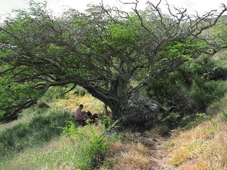 Ganz kurz nach dem Meilenmarker 3 (wird von Ma'alaea aus berechnet, nicht von jener Stelle, von wo wir starteten – von unserer Richtung sind es bis hierher 2,5 Meilen) steht ein großer Baum, um dem herum zahlreiche große Steine liegen. Der ideale Platz für ein Picknick :!: