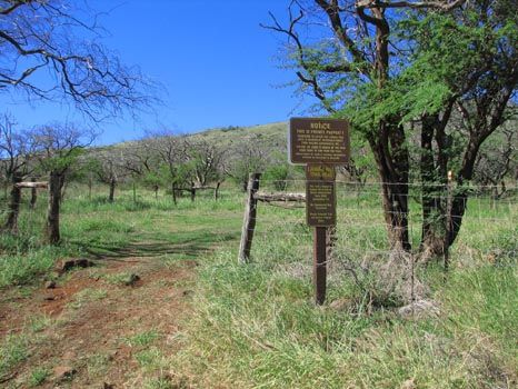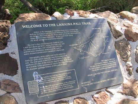 Unmittelbar an der linken Seite des offiziellen Parkplatzes ist der Durchschlupf zum Trail. Mountainbiken ist verboten, nur hiken ist erlaubt. Kaum haben wir den Durchschlupf passiert, erwarten uns linkerhand Info-Tafeln „welcome to the Lahaina Pali Trail“ (noch mal soviel zum Thema, der Trail ist nicht ausgeschildert… Manchmal kann ich mich wirklich nur mehr wundern…).
