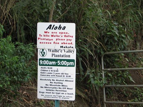 Da wir am Weg dorthin ohnehin bei der Zufahrt zum Waihe’e Valley Trail vorbei kommen und ich gelesen habe, dass man neuerdings Eintritt zahlen muss, möchte ich mich gerne vergewissern, ob das richtig ist. Tatsächlich :!: Ein Schild besagt, dass Erwachsene $5 zahlen müssen und dass das Gate von 9 am bis 5 pm geöffnet ist…