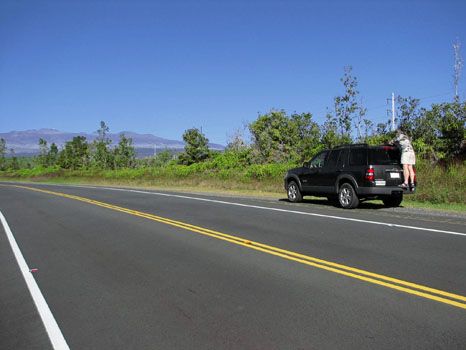 Beim MM 28 steht linkerhand das uns schon bestens bekannte Hunter Checkin-Häuschen, wo wir uns kurz einparken. Ein Blick auf den gegenüberliegenden Mauna Kea zeigt, wir können die Mana Road in Angriff nehmen, das Wetter ist traumhaft schön.