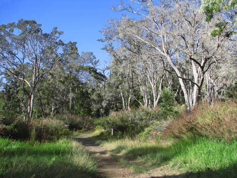 Bei strahlend blauem Himmel wandern wir durch einen angenehm kühlenden Wald, eine Mischung aus Koas, Ohias und Eukalyptus, auch wachsen einige Baumfarne.