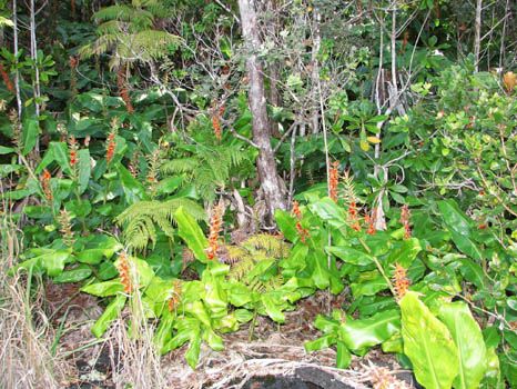 Der Abstieg in den Krater führt uns durch einen märchenhaften Farnwald, es ist fast schon kitschig. Immer wieder stelle ich mein Manfrotto auf, um nicht verwackelte Filmaufnahmen machen zu können. Zwischendurch erhaschen wir Blicke in den Kilauea Iki Crater, verblühende Ginger-Blüten säumen unseren Weg.