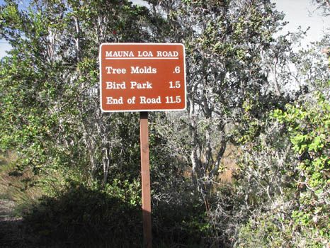 Hier empfängt uns ein Schild mit genauen Meilenangaben. Darauf steht u. a. geschrieben, dass es bis zum Bird Park, auch Kipuka Puaulu genannt, 1,5 Meilen sind.