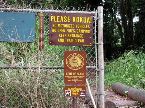In diese einbiegen und so lange entlang fahren, bis rechterhand die Waikupanaha Street sichtbar ist. Dieser solange folgen, bis man zu nachfolgend abgebildeten Maschendrahtzaun und der Trailbeschriftung kommt.