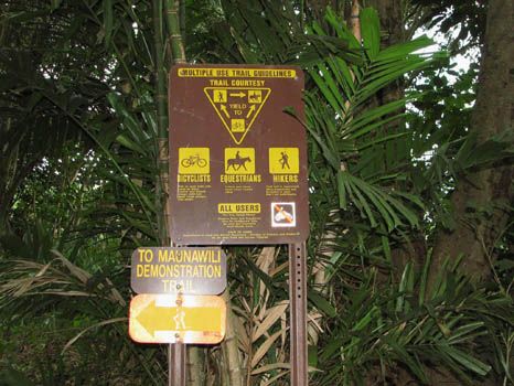Zu Beginn ist der Weg noch ziemlich breit, sodass wir nebeneinander gehen können. Schon bald kommt das nächste Schild, nämlich Maunawili Demo Trail links gehen.