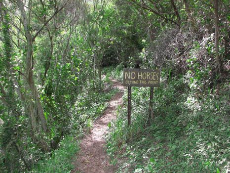 Nach einiger Zeit, der Trail ist weiterhin sehr schmal, zudem geht es linkerhand steil bergab, sehen wir ein Schild mit der Aufschrift „no horses beyond this point“.