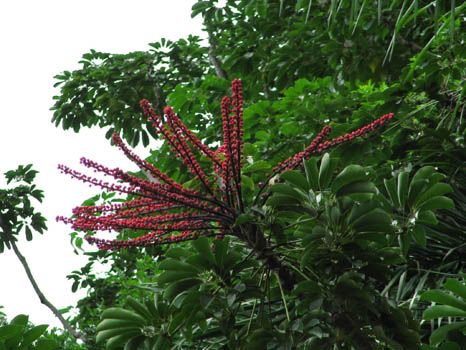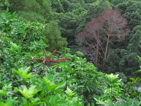 Auffallend ist, dass hier hauptsächlich Eukalyptusbäume wachsen, aber auch Paper Trees, Ti-Pflanzen, Palmen und Farne. Ab und zu sehen wir einen Octopus Trees.