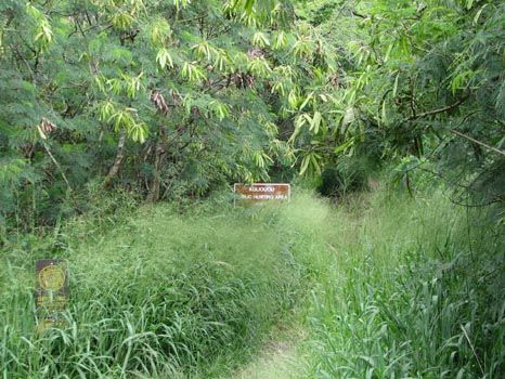 Ich gucke ein wenig herum und kann in ungefähr 15 m Entfernung ein im hohen Gras stehendes Schild entdecken, das ich wegen des Grases nur teilweise lesen kann. Es steht irgendwas von „Kuliouou“ und „Hunting“ geschrieben. Das könnte also richtig sein.