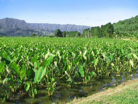 Und schon begegnet uns das erste Taro-Feld. Taro ist ein Knollengewächs, das im Wasser wächst und besonders im Norden von Kaua’i sehr häufig angebaut wird.