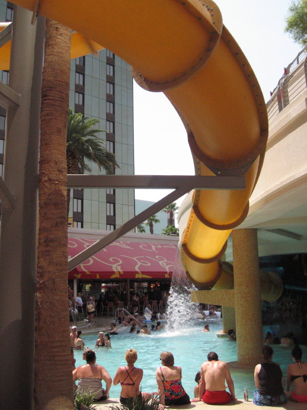 29.06.2013Oh Gott ist mir schlecht.. Also eigentlich nicht richtig schlecht, sondern einfach nur Kreislauf *örk*. Weil wir es in den vergangenen Aufenthalten nie an den Pool des GN geschafft haben, ignoriere ich meinen schlechten Allgemeinzustand und wir schlendern zur Tarnung der Augenringe mit großer Sonnenbrille und Hut zum Pool. Zuerst an der Schlange der Wasserrutsche rauf Richtung "Hide-Out".. Na klasse, alle Daybetten und Cabanas sind sold out.. Also an der feixenden Menge wieder runter und in Ermangelung von freien Plätzen setzen wir uns halt an den Rand des pisswarmen Beckens. Aber eigentlich ist es ganz nett und im Schatten auch gut auszuhalten. Wir lästern ein bisschen über die andern Badegäste und kühlen uns zwischendurch im Pool ab. Immerhin ist er noch einige Grad kälter, als die Umgebungsluft.