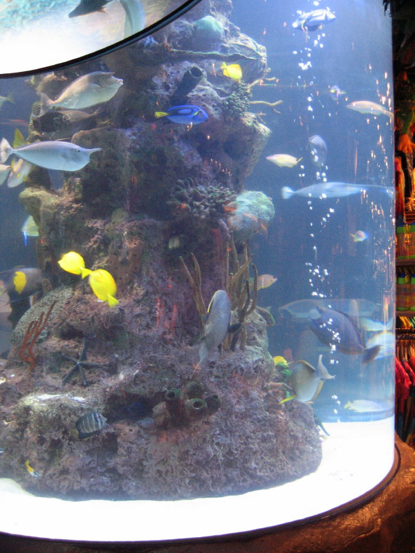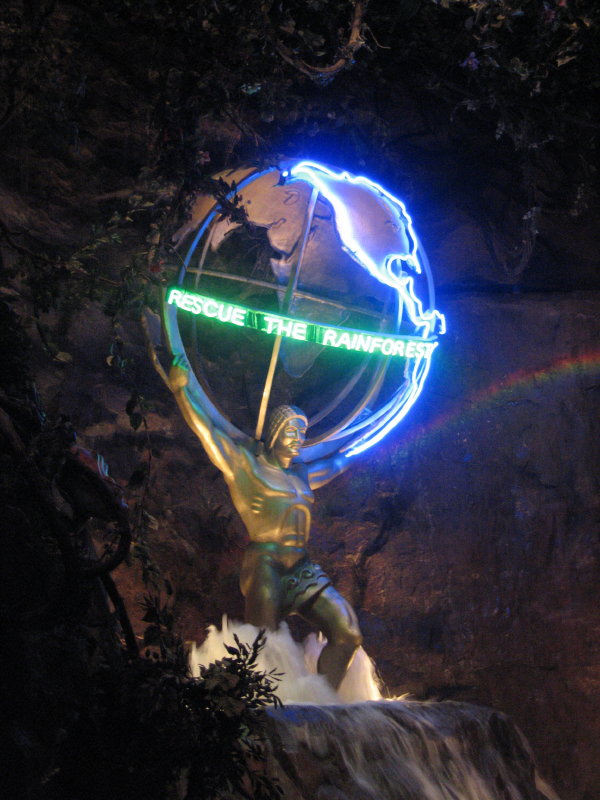 Die Wahl fällt auf's Rainforest Café. Dort waren wir noch nicht und wir müssen nicht lange warten. Am Eingang steht ein großes Aquarium und in der Gaststätte selbst sind einige, ausgestopfte Tiere, die sich in regelmäßigen Abständen "bewegen".
