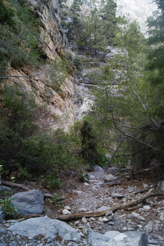 Wir wollen den Fletcher Canyon Trail laufen, sind aber nicht wirklich gut auf den steinigen Weg vorbereitet. Ich kann mit meinen Turnschuhen noch ganz gut laufen, aber Patrick ist mit seinen italienischen Schühchen eher mühsam unterwegs. Zu allem Überfluß stellt er nach wenigen Metern fest, daß er sein Asthma-Spray im Hotel vergessen hat.