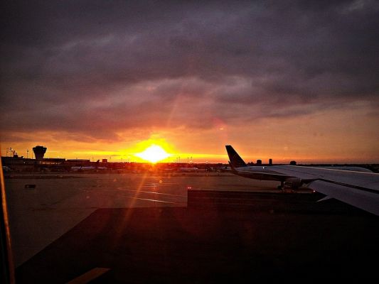Aus dem Flugzeug heraus bekamen wir dann tatsächlich noch den letzten Blick auf die Skyline, leider nur durch das gegenüberliegende Fenster, wir mussten uns mit diesem Sonnenuntergang begnügen