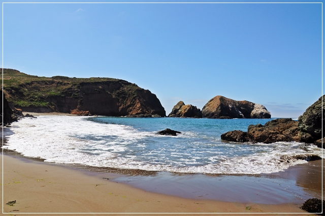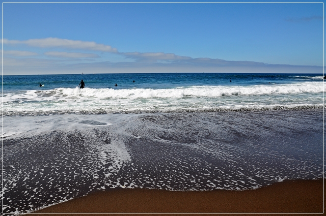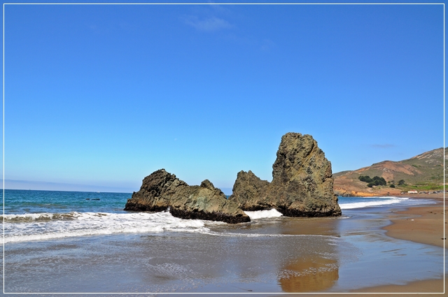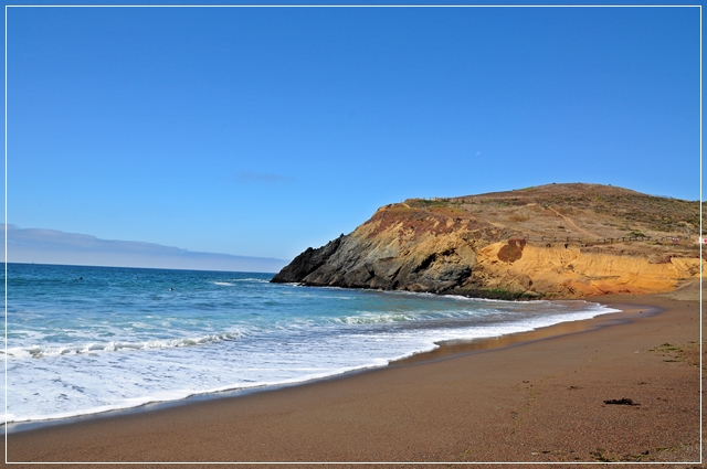 Letztes Jahr hatten wir es ja nur bis zum obligatorischen Aussichtspunkt an der Conzelman Road geschafft. Dieses Jahr sollte es also etwas weiter gehen. Der erste Halt war Rodeo Beach. Zum Baden war es – wie sollte es auch anders sein – viel zu kalt (aber ich will ja nicht meckern, schließlich hatten wir die ganze Zeit strahlenden Sonnenschein), nur ein paar Surfer haben sich ins Wasser getraut. Allzu hohe Wellen gab es aber nicht.