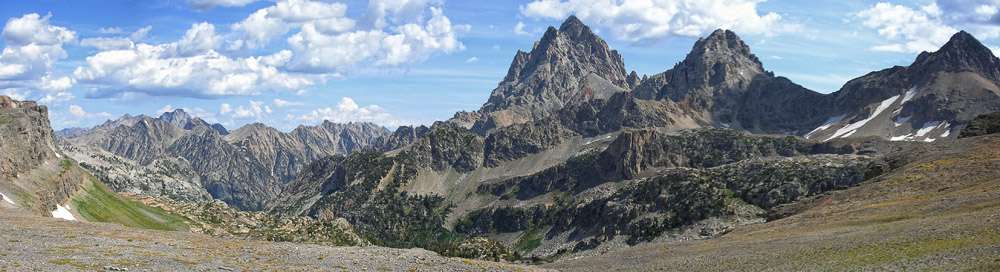 Schliesslich kommen wir am Hurricane Pass an und geniessen das beeindruckenden Panorama. Direkt vor uns ragen Grand Teton und die beiden Kollegen Middle und South auf. Links geht es entlang des South Fork Cascade Creek in den Cascade Canyon. Wenn man dem Canyon folgen wuerde kaeme man oberhalb des Jenny Lake am Inspiration Point wieder raus. (@Raigro: wenn Du damals Deine Tageswanderung gen Sueden fortgesetzt haettest, waerst Du auf dem Panorama-Bild links von Grand Teton aus dem Tal hochgekommen)