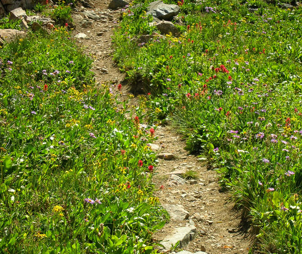 Oberhalb des Basins kommen wir in ein Becken, in dessen Mitte der Sunset Lake liegt. Der See ist von Bergwiesen umgeben, die voll von Blumen sind. Auch wenn wir den allerbesten Zeitpunkt fuer die Bluete hier oben wohl um etwa ein, zwei Wochen verpasst haben ist es immer noch traumhaft durch einen bunten Blumenteppich zu wandern.