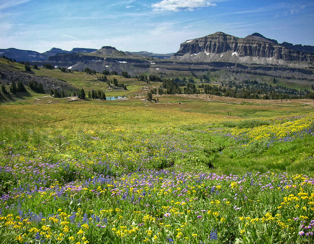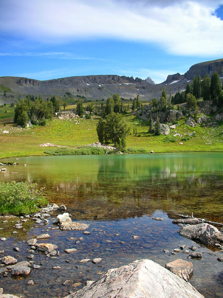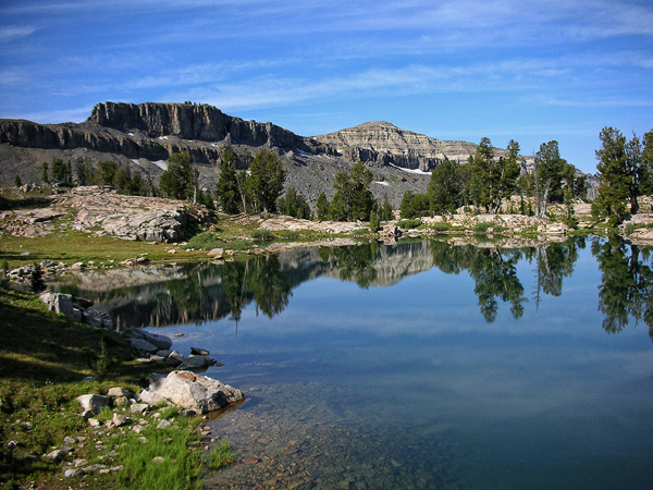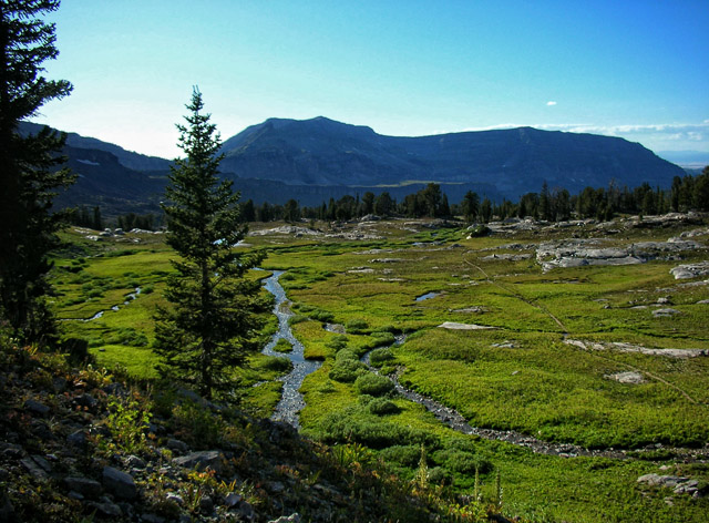 Eine traumhafte Landschaft. Umgeben von steilen Bergwaenden findet man hier eine von Baechen durchzogene Ebene mit vielen kleinen Seen. Es ist das Quellgebiet des Teton Creek, dem wir auf unserem Weg hinauf gefolgt sind.