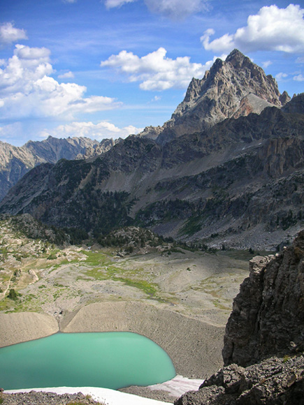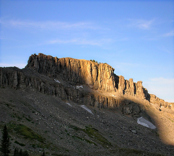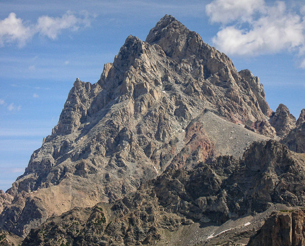 Eigentlich hatten wir geplant, hier umzukehren, aber nach Suedwesten erstreckt sich eine Formation die den treffende Namen "The Wall" traegt. Wir entschliessen uns so weit wie moeglich auf der "Mauer" hoch zu klettern. Wir erreichen einen Aussichtspunkt oberhalb des Passes, wo wir Mittag machen. Der Blick geht von den Kartoffelfeldern Idahos hinter Battleship Mountain im Westen ueber das Alaska Basin im Sueden, die drei Tetons im Osten und den Cascade Canyon mit dem Mt.Moran dahinter im Norden. Auch wenn es dem Essen ein wenig an Rafinesse fehlte (Jerky, Gorp und Riegel), die Aussicht holte alles wieder rein. The Wall kann ich als Lunch Location sehr empfehlen.