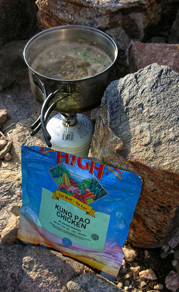Ich hatte im Outdoor-Laden eine Tuete mit meinem chinesischen Lieblingsessen Gongbaojiding gefriergetrocknet gefunden und heimlich mit auf den Berg geschmuggelt. Da half es auch nichts, dass ich demonstrativ die Zutatenliste vorlas, die wie ein Stoerfall bei Bayer klang.