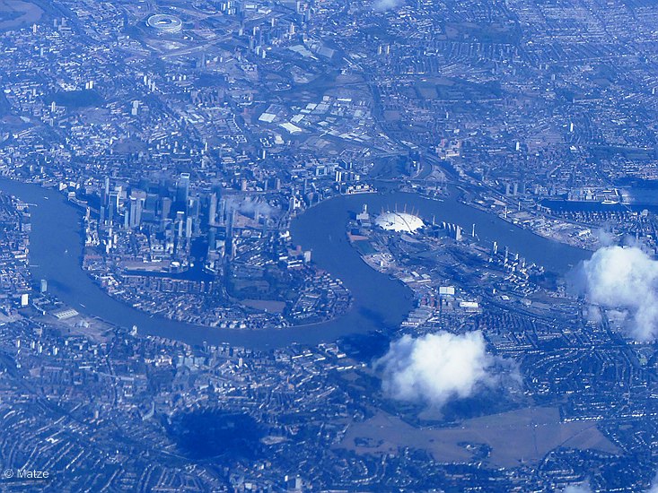 Ihr schaut da gerade hinunter auf Greenwich, das Royal Observatory direkt unter der linken Wolke  :wink:, in der Flußbiegung der markante Millenium Dome und am oberen Bildrand das London Stadium von West Ham United  8)