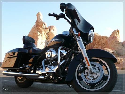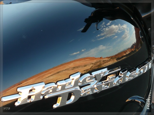 Um ca. 10 Uhr setze ich Caro beim Hotel ab, damit sie das Auto holt und ich mache mich auf den Weg Richtung Harley. Auf einmal ist es wie eine Fahrt auf Eiern und das Hinterrad macht ungewöhnliche Fahrgeräusche. Geräusche, die sehr an einen Plattfuss erinnern. Ich fahre rechts ran und sehe, dass ich mich leider nicht getäuscht habe. So ein Mist. Nicht schon wieder… Vor zwei Jahren ist uns das mit dem Auto schon auf der House Rock Valley Road auf dem Rückweg von White Pocket passiert. Nur hat man beim Bike keinen Ersatzreifen dabei. Ich entscheide aber die restlichen 2 Meilen bis zum Ziel noch so zu fahren.
