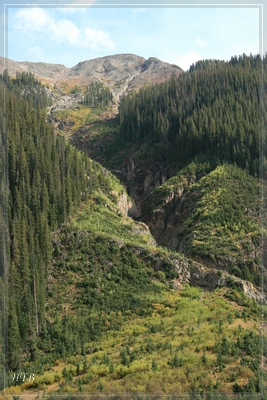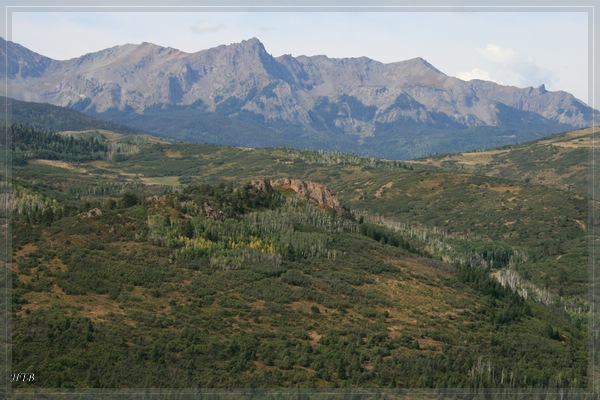 Die Bourbon-Party von gestern hat die Auswirkung, dass wir heute erst viel später hochkommen als geplant und erst um 9:00 Uhr unser Hotel verlassen. Nördlich von Ouray liegt Ridgway und hier wollen wir einen kleinen Abstecher in eine gerade zur Herbstzeit wohl sehr schöne Berglandschaft machen. Die Gravelroad führt in den ersten Metern durch ein Wohngebiet, wo alle 20 Meter vor den querenden Straßen ein Stopschild steht. Caro sitzt am Steuer. Wir fahren diese Road ca. 10 Meilen in das Gebiet hinein. Es entwickelt seine Schönheit wohl wirklich erst, wenn sich das Laub verfärbt und bietet uns heute nichts Aufregendes.