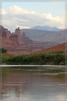 Der Weg nach Moab über die 128, den so genannten Colorado Riverway, ist immer wieder toll. Nur werden nun die Wolken schon wieder immer dunkler. Auch wenn Wetter und Licht heute überhaupt nicht stimmen, wollen wir mal dieses bekannte  Foto vom Fisher Towers und den La Sal Mountains „aus“ dem Colorado River schießen. Wir parken unser Auto und schlagen uns am Ufer durch die Büsche, aus denen Schwärme von kleinen Fliegen kommen sobald man sie berührt. Das Stativ und wir beide passen geradeso auf den Stein im Fluß und dies ist das Ergebnis: